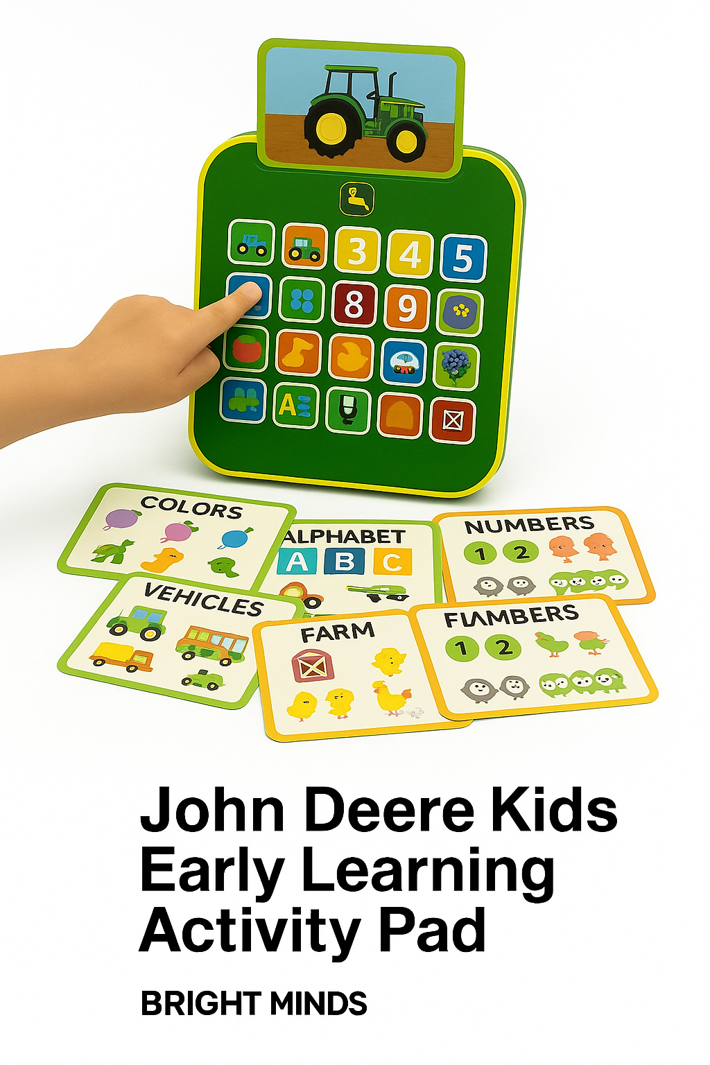 An interactive learning tablet that helps young children develop early reading, counting, and problem-solving skills through colorful buttons and activity cards.